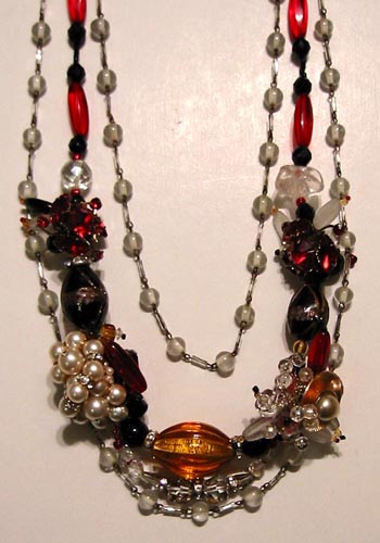 Unique Jewelry, This Beaded Necklace in Black/Clear/Red and Amber. Spring Clasp Closure.