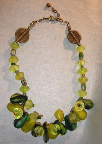 “Lemon Drop” Beaded Necklace 9: Put on a Happy Face With This Cheery, Handmade Beaded Necklace in Lime Green and Citrus Lemon Yellow. A Colorful Jewelry Necklace of Vintage Trade Beads From Africa. The Majority are Czech Beads and Venetian Beads, and Include Mali Wedding Beads, Melon Beads, and Old Vaseline Bicone Beads. Wedding Beads are Predominately Pear Shaped, but There are Also Some of the More Difficult to Find…Claw Shaped, Faceted, Fluted, and One Resembling an Artichoke.